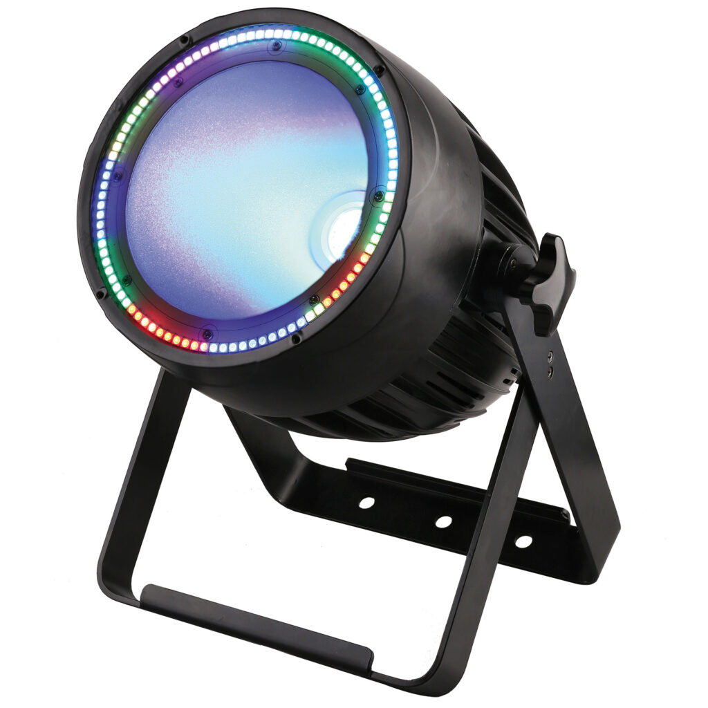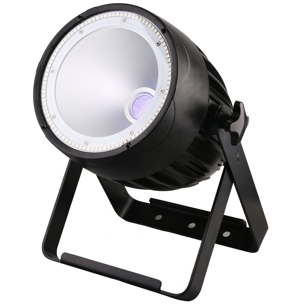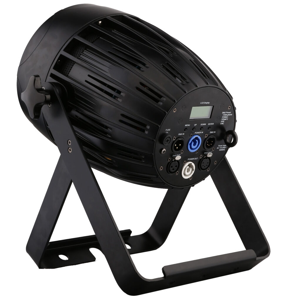 – 1 led cob de 200w (rouge, vert, bleu, blanc, ambre) – Ouverture 50° – prises DMX 5 broches – mode DMX de 5 à 134 canaux