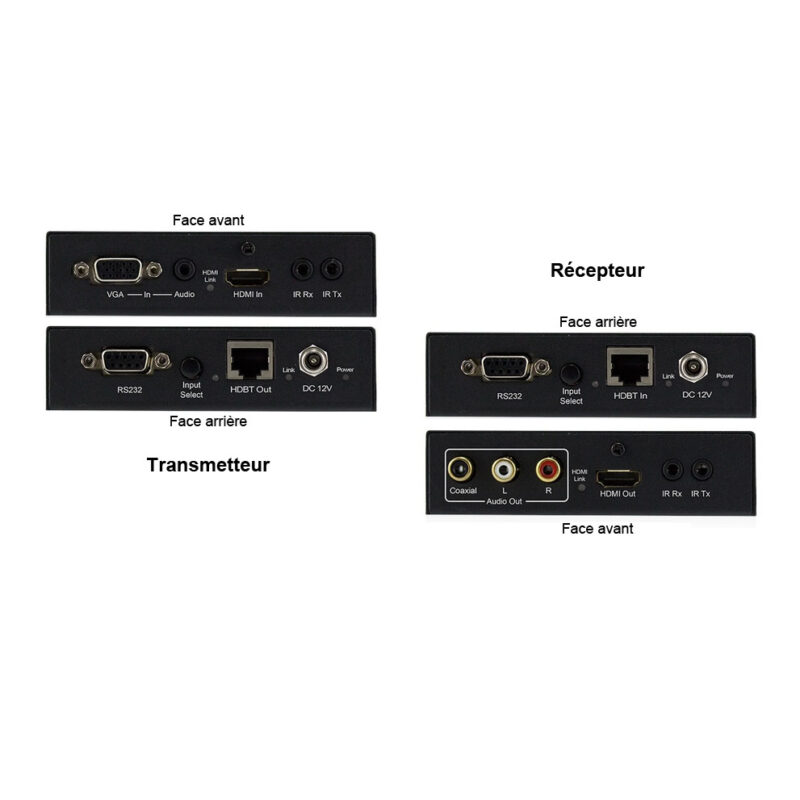 – 1 boitier émetteur avec 1 entrée HDMI, 1 entrée VGA+audio sur mini jack, 1 entrée pour infra-rouge, 1 sortie pour infra rouge